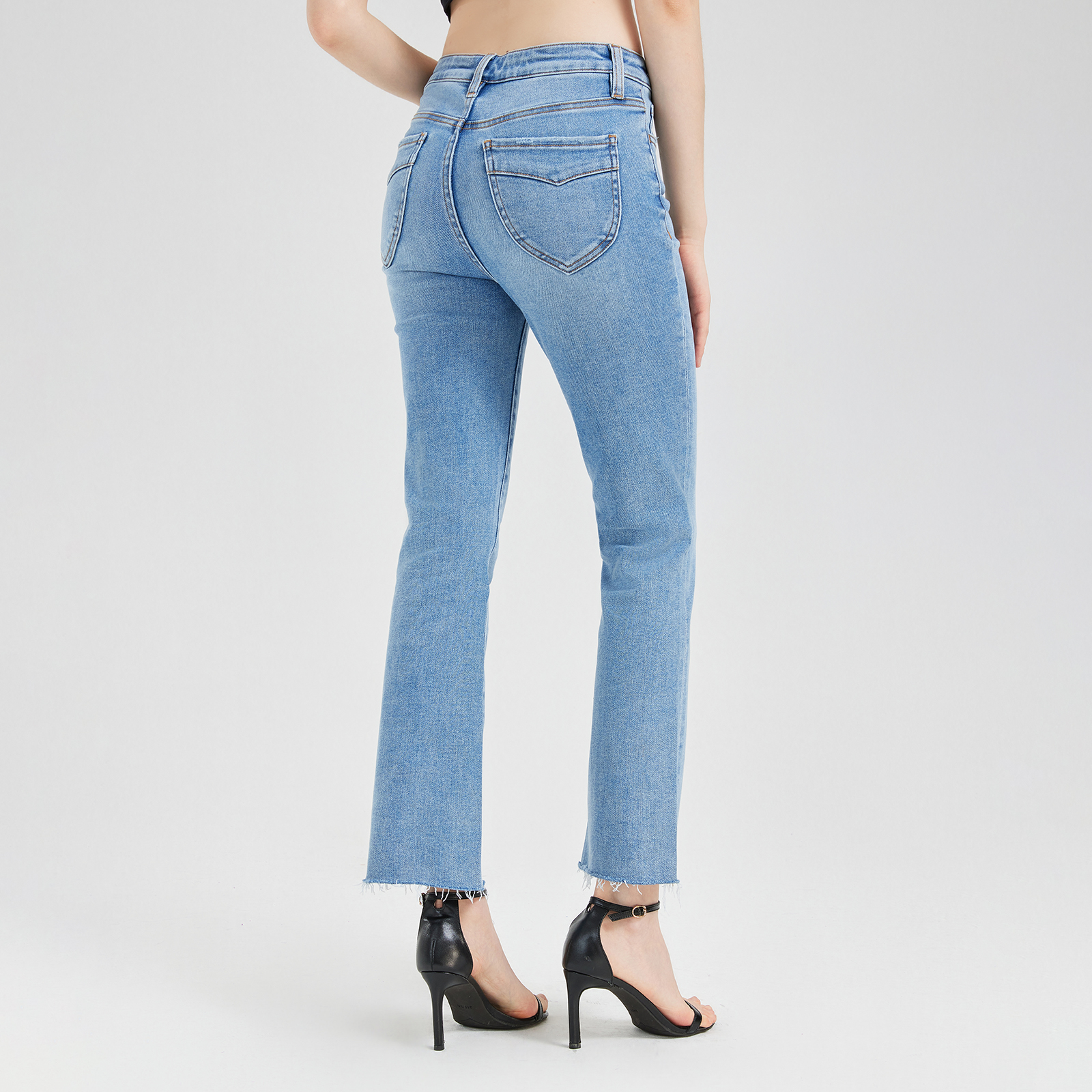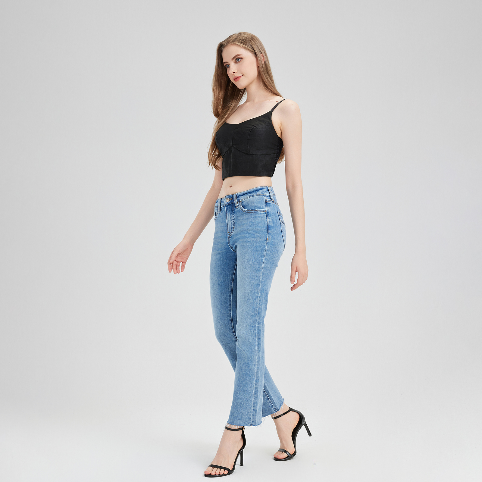 Comfort stretch denim, high rise waist, unique seam and front patch pocket detail, finished hem, cropped length, barrel leg jeans